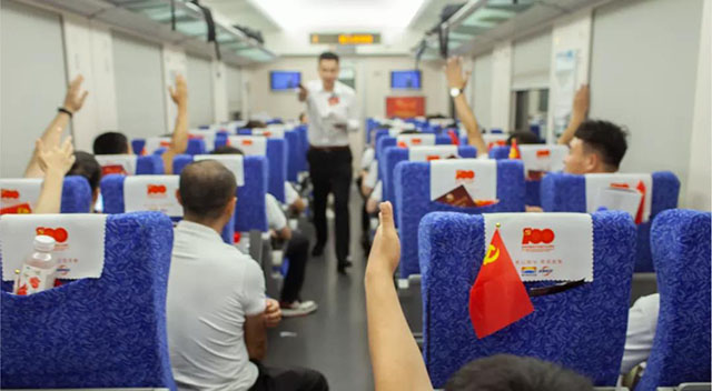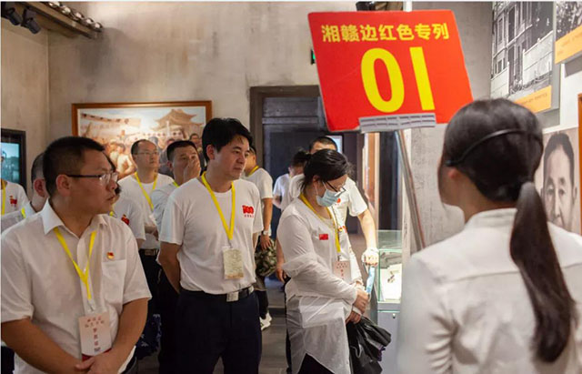 隨著“湘贛邊紅色專列”駛?cè)胝九_,黨員們登上專列車廂參與了一場特別的“七個一”學(xué)習(xí)教育:重溫一遍入黨誓詞、學(xué)習(xí)一段中共黨史、聆聽一路紅色黨課、宣講一路紅色故事、誦讀一篇紅色經(jīng)典,高唱一組革命歌曲,回味一頓紅軍餐?!捌邆€一”系列活動,讓黨史學(xué)習(xí)“動起來”“活起來”。