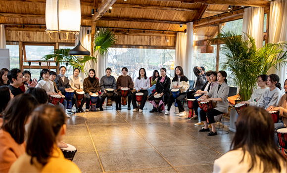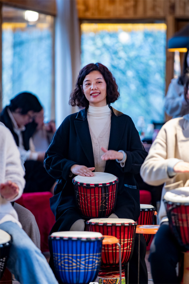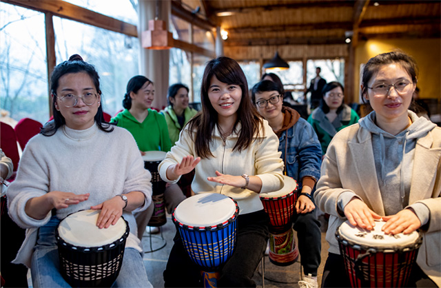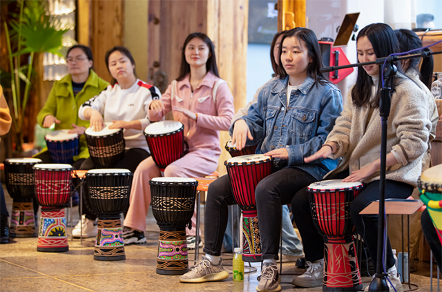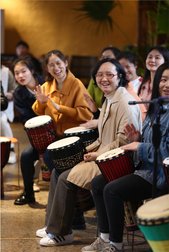 在專業(yè)老師的指導下,大家很快掌握了非洲鼓的基本手勢、鼓點、節(jié)奏和技巧,并共同演繹了《橋邊姑娘》。在節(jié)奏明晰、錚錚悅耳的鼓聲中,大家感受到了激情與奔放,享受到了最純粹的快樂。