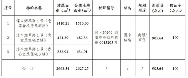 受瀏陽(yáng)市淳口鎮(zhèn)人民政府委托,根據(jù)國(guó)有資產(chǎn)管理的相關(guān)規(guī)定,我公司定于2021年1月19日上午10:00在瀏陽(yáng)市城鄉(xiāng)發(fā)展集團(tuán)有限責(zé)任公司8樓會(huì)議室(人民東路60號(hào)),對(duì)委托人所屬的位于瀏陽(yáng)市淳口鎮(zhèn)煙草路1號(hào)的3宗房地產(chǎn)權(quán)向社會(huì)進(jìn)行整體公開(kāi)拍賣。標(biāo)的基本情況如下: