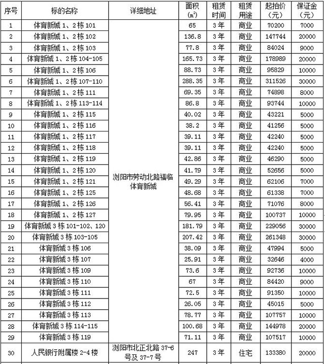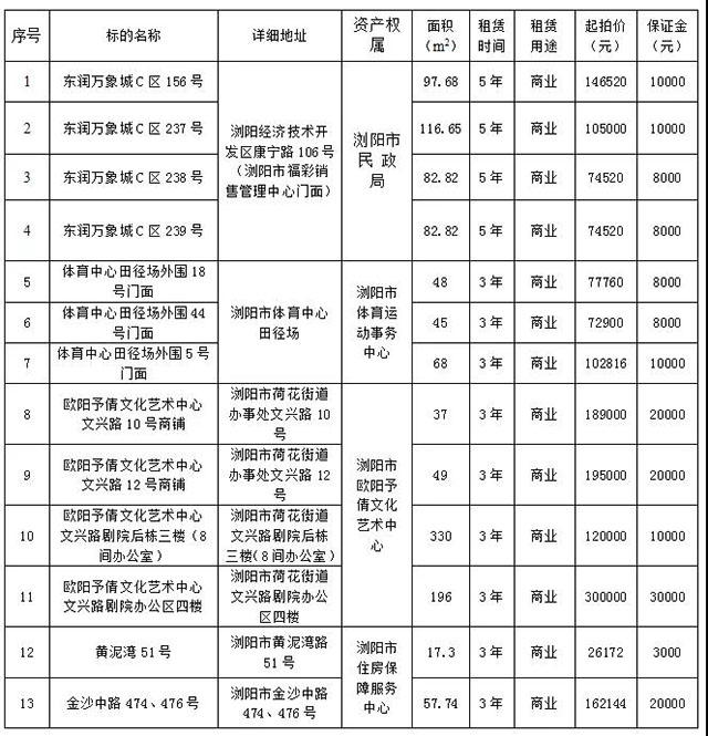 受瀏陽市民政局、瀏陽市體育運(yùn)動(dòng)事務(wù)中心、瀏陽市歐陽予倩文化藝術(shù)中心和瀏陽市住房保障服務(wù)中心委托,根據(jù)國有資產(chǎn)管理的相關(guān)規(guī)定,我公司定于2021年7月28日上午10:00在瀏陽市城鄉(xiāng)發(fā)展集團(tuán)有限責(zé)任公司8樓會(huì)議室(人民東路60號(hào)),對下列標(biāo)的面向社會(huì)進(jìn)行公開拍租,標(biāo)的情況見下表: