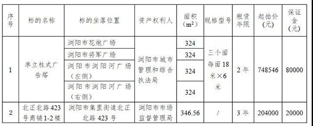 受瀏陽市城市管理和綜合執(zhí)法局委托,根據(jù)國有資產(chǎn)管理的相關(guān)規(guī)定,我公司定于2021年7月30日上午10:00在瀏陽市城鄉(xiāng)發(fā)展集團(tuán)有限責(zé)任公司8樓會(huì)議室,對下列標(biāo)的面向社會(huì)進(jìn)行公開拍租,標(biāo)的情況見下表: