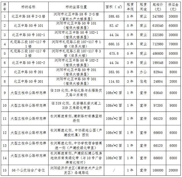 受瀏陽市農業(yè)發(fā)展事務中心和瀏陽市金泰城市運營管理有限公司委托,根據(jù)國有資產管理的相關規(guī)定,我公司定于2021年12月16日上午10:00在瀏陽市城鄉(xiāng)發(fā)展集團有限責任公司8樓會議室,對下列標的租賃權面向社會進行公開拍租,標的情況見下表: