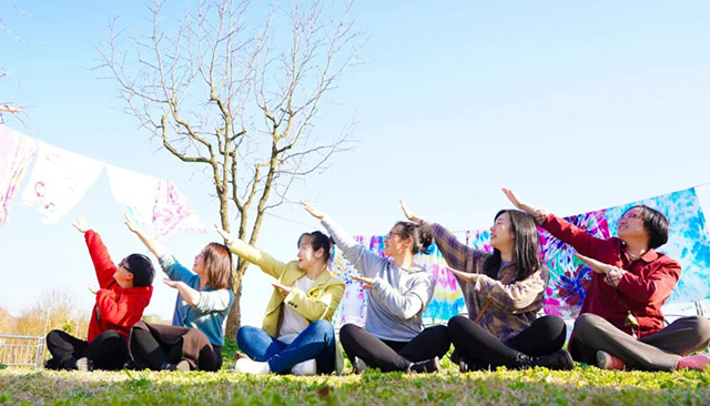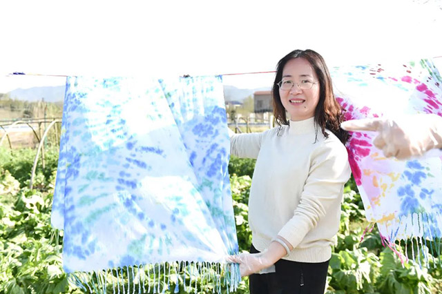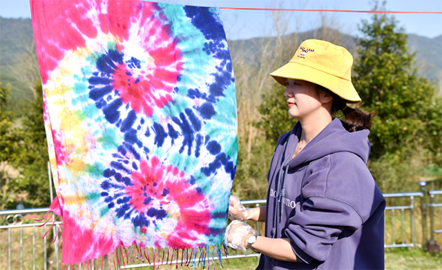 在現(xiàn)場老師的指導(dǎo)下,大家借助線繩、皮筋等工具,將圍巾折疊、纏繞、打結(jié)固定,然后在潔白素凈的圍巾上侵染上自己精心挑選的顏色。