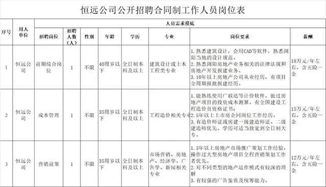 本次計劃招聘3名工作人員,與恒遠公司簽訂勞動合同。具體情況見下。